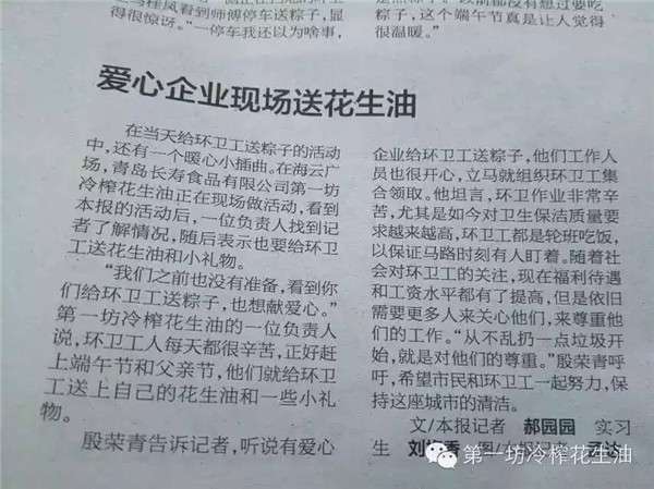 端午活动当天还出现了暖心的一幕,第一坊冷榨花生油健康品鉴会活动现场同时进行着另一场活动---半岛都市报组织的为环卫工送粽子爱心活动。当第一坊冷榨花生油负责人得知这一活动后,主动找到献爱心活动组织者,为环卫工人献上第一坊端午爱心。